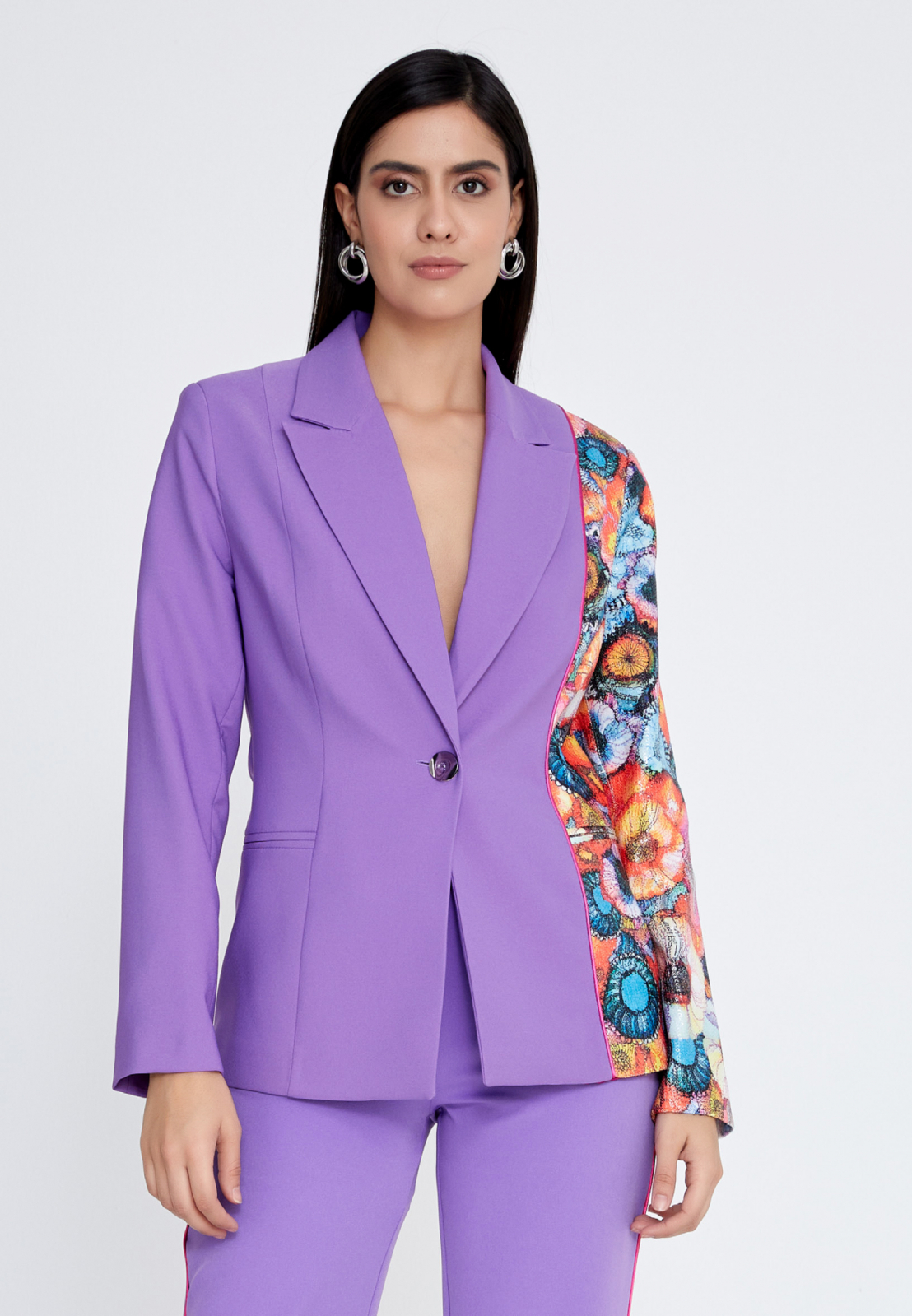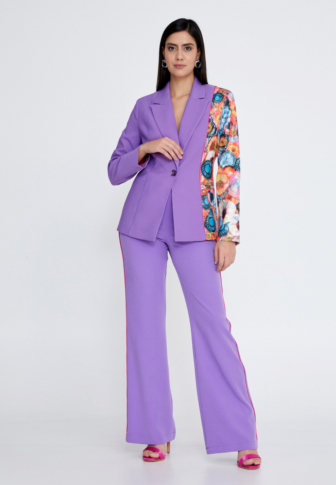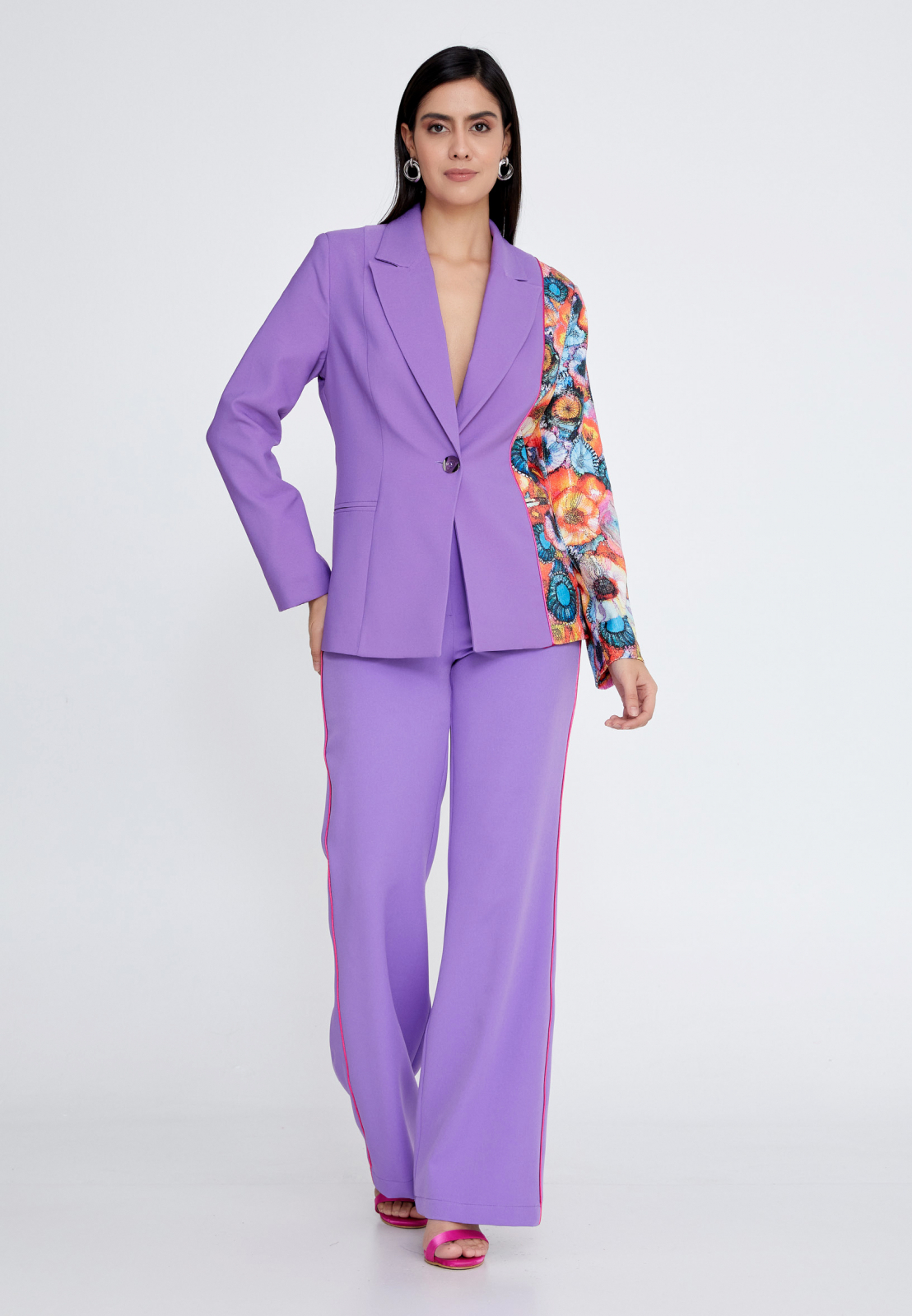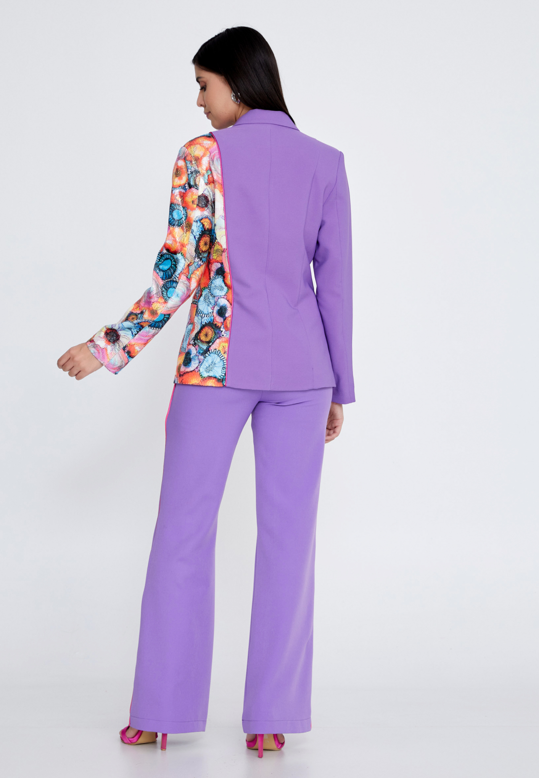 Compleul Lila elegant si vribant scoate in evidenta feminitatea din tine. Format din sacou si pantaloni are o pata vie de culori ce reflecta indrazneala si creativitatea acestui set.
