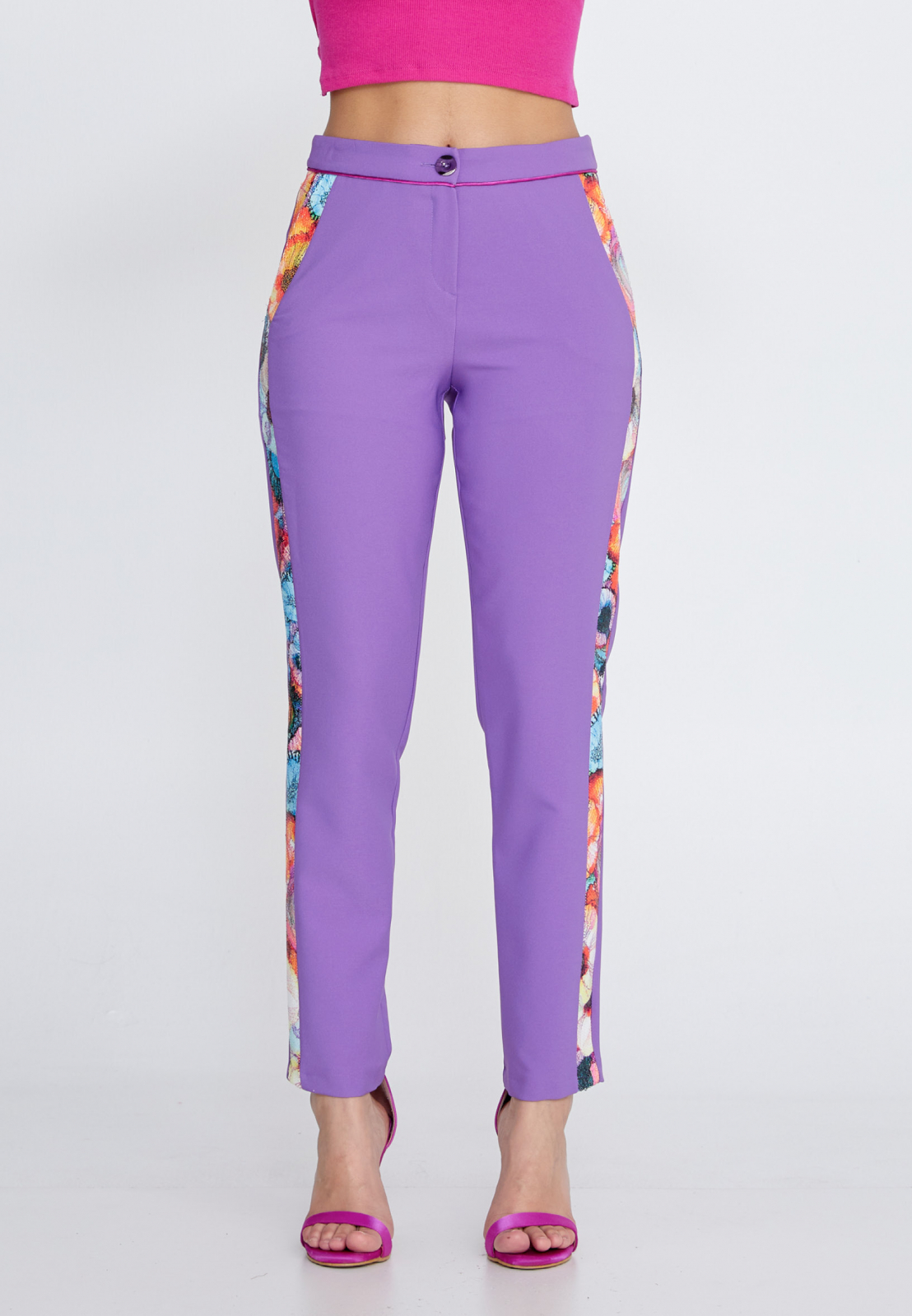 Sacoul se inchide cu nasture, este accesorizat cu paiete viu colorate. Pantalonii sunt cu talie inalta si conici. Modelul poarta marimea (36)