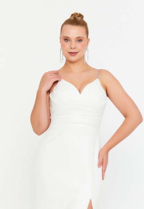Rochie alba lunga, mulata cu bretele subtiri si crapatura laterala eleganta - perfecta pentru o cununie civila in stil minimalist, dar sofisticat.