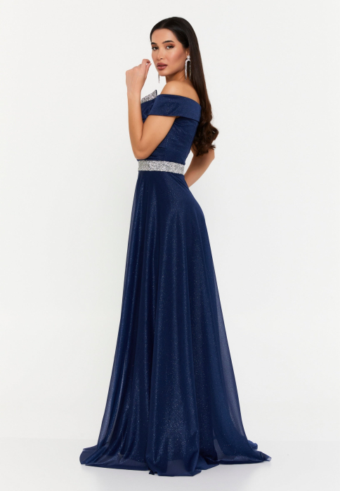 Rochie lunga eleganta vacy cu sclipici - un adevarat statment de eleganta pentru evenimente speciale! Aceasta rochie maxi in nuanta rafinata de bleumarin este decorata cu sclipici fin care reflecta lumina la fiecre miscare, oferindu-ti un look stralucitor si sofisticat pentru seri de gala, nunti, petreceri sau baluri.