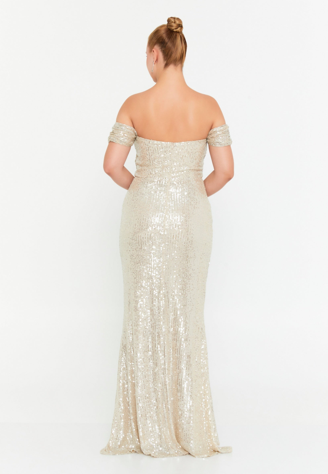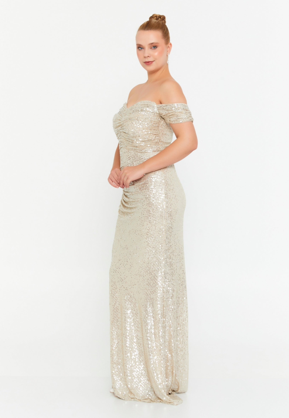 Rochie lunga crem cu paiete si maneci pe umar - eleganta stralucitoare penru orice eveniment special!